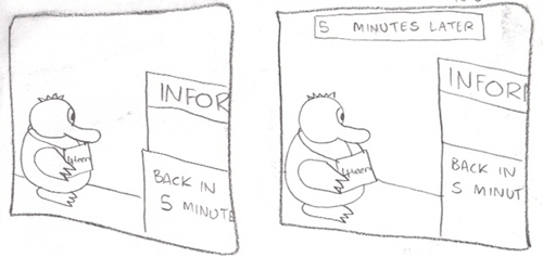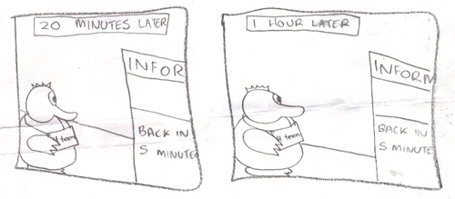 On that note, my fine feathered friends, I bring you the very first appearance of The Weasel; seen here making a cameo appearance in a short 2001 6-panel comic starring legendary comic character Franky the 4th Eated Duck (also note the origins of the catchphrase Sorry I’m Late – the same as the very website you are viewing!)